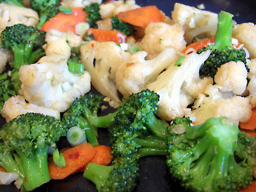 1. Steam broccoli, cauliflower and carrots until just tender.